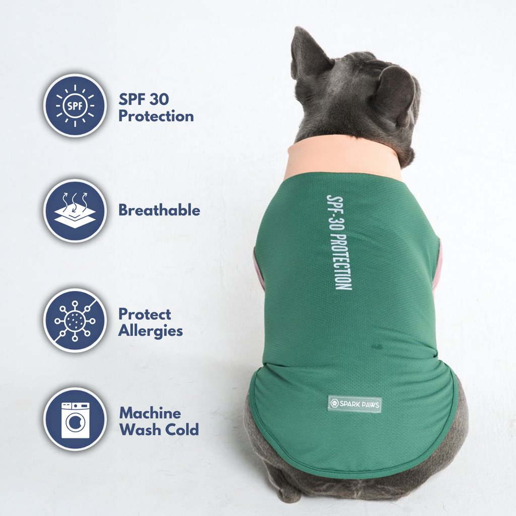 Protect your dog from the sun with our SPF 30/UPF 30 Sun-Block Dog T-Shirt, blocking 96%+ of harmful UVB rays while keeping your dog clean and allergen-free.